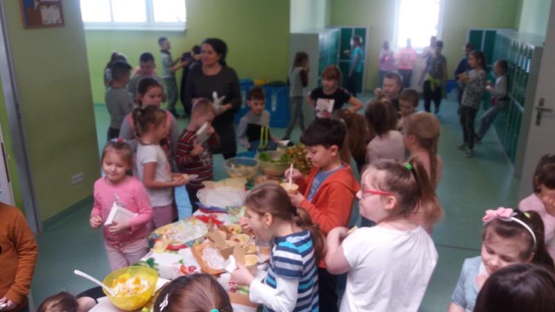 Najmłodsi w naszej szkole w pierwszy dzień wiosny przygotowali pyszne zdrowe śniadanie. Na talerzach dominowały warzywa, czuć było smak witamin, żelaza i innych mikroelementów bardzo ważnych dla zdrowia .